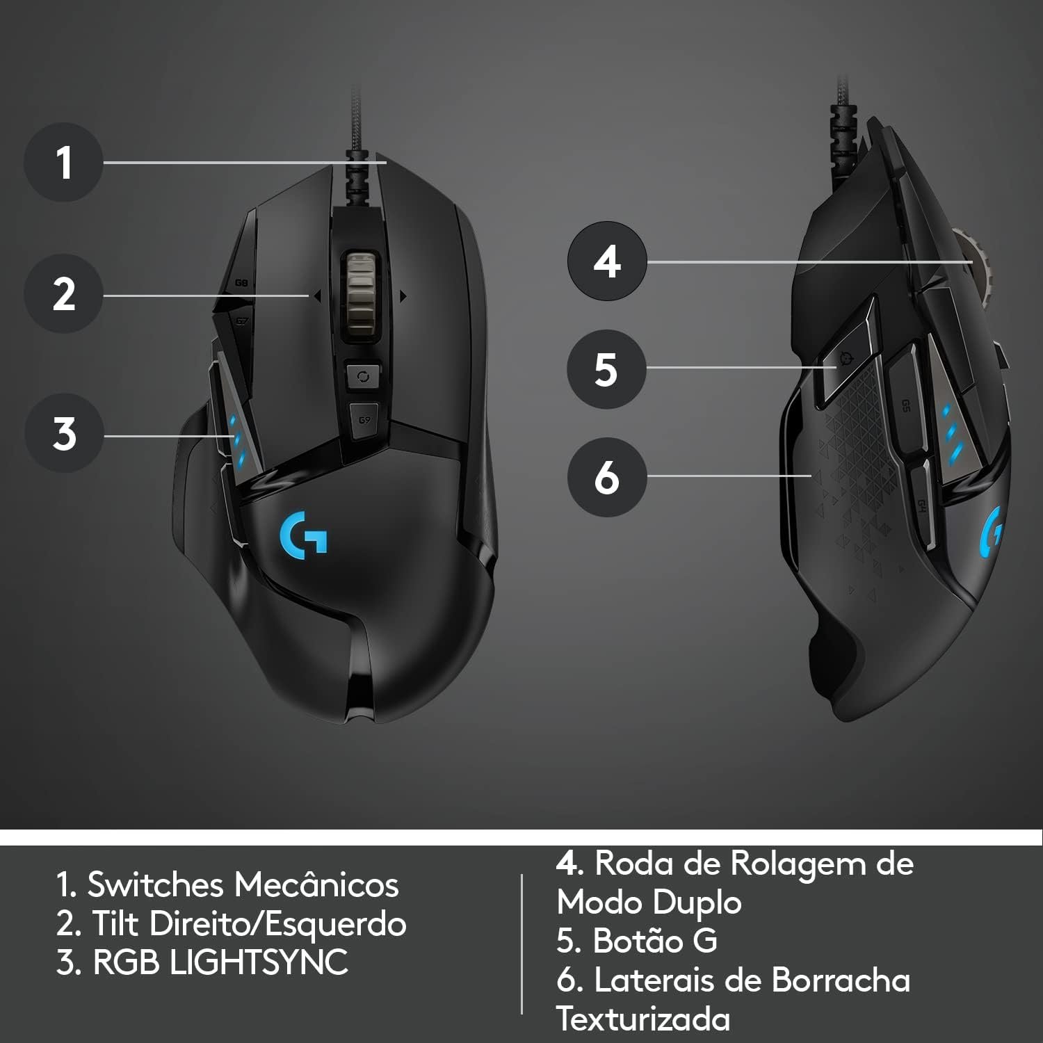 - Tecnologia LIGHTSYNC – A tecnologia Logitech G LIGHTSYNC oferece iluminação RGB totalmente personalizável que também pode ser sincronizada ao seu jogo.* *Requer o Software Logitech GHUB, disponível em logitechG.com/downloads.