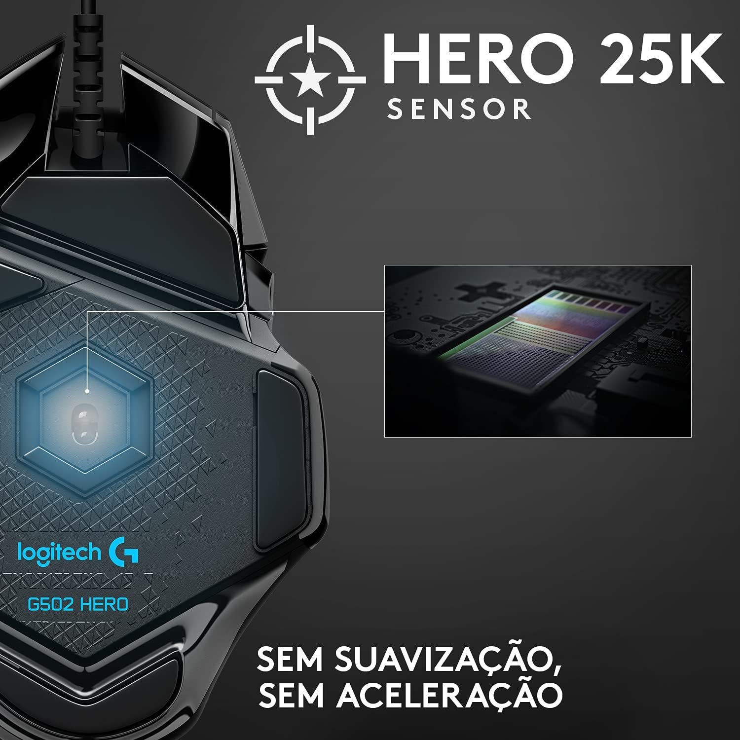 - Sensor HERO 25K – O sensor HERO de última geração oferece rastreamento de precisão de até 25.600 DPI com suavização, filtragem ou aceleração zero.