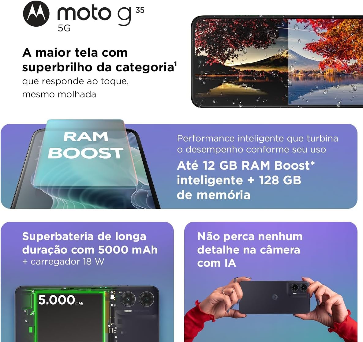 Smartphone Motorola Moto g35 5G – 128GB 12GB (4GB RAM+8GB Ram Boost) e Camera 50MP com AI NFC Tela 6.7″ com Superbrilho – Verde