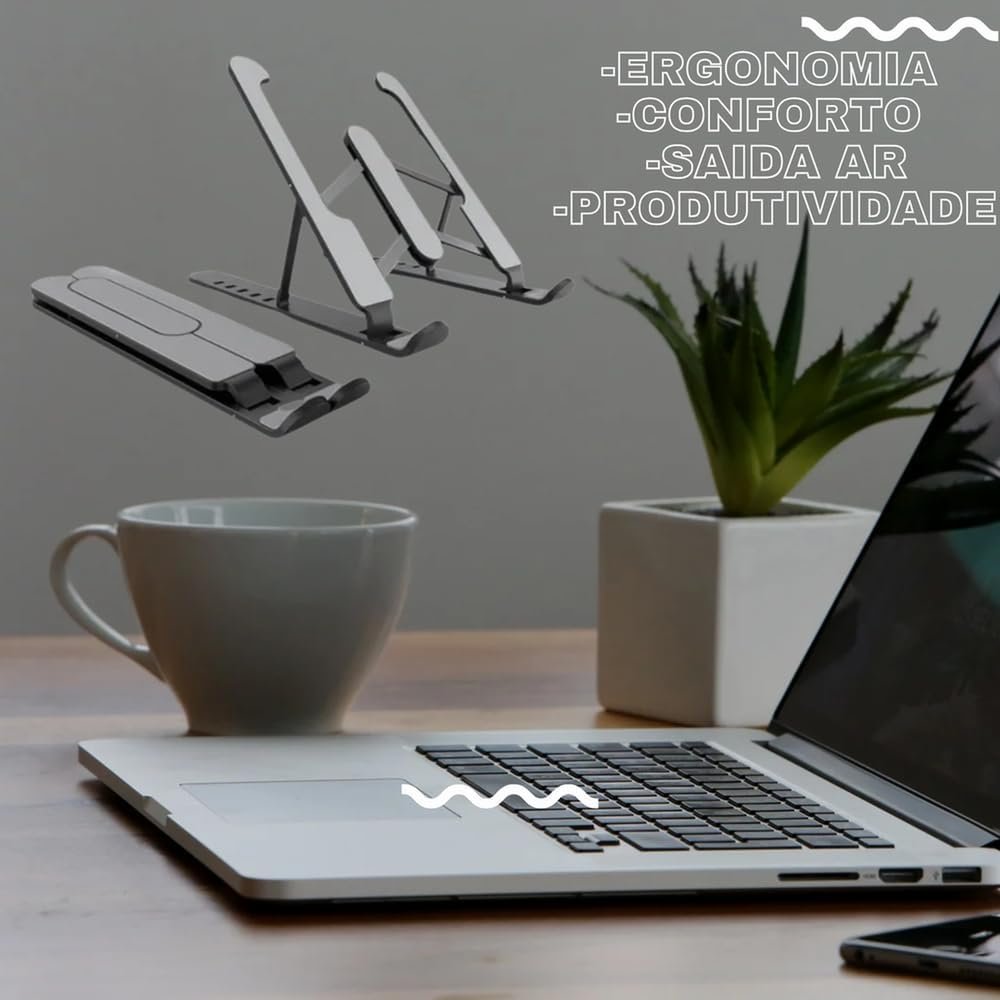 Suporte Ajustável Liga ALUMINIO para Notebook, 6 POSICOES, saida de ar, serve para notebook tablet celular qualquer eletronico, Ergonômico, Dobrável, 26 x 19 cm, Premium